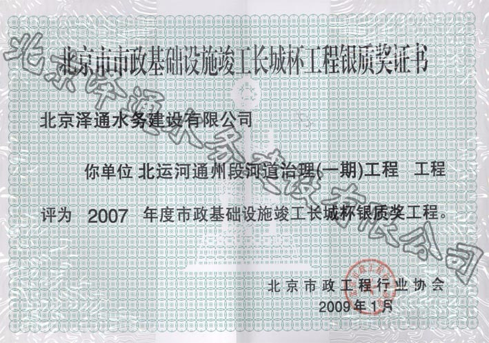 長(zhǎng)城杯銀質(zhì)獎(jiǎng)證書(shū)